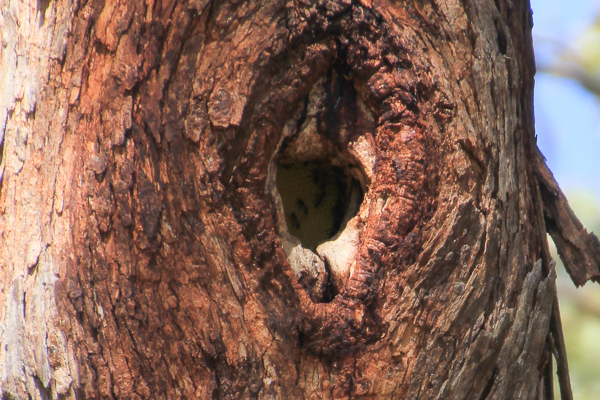 Wherever the bees ended up, I hope they did not colonise in a bird nesting hollow. While we were looking for the swarm we found an actual hive in a hollow formerly used by a pair of Galahs, and by Crimson Rosella. Honeycomb was visible in the hollow, so we assume this is where the swarm came from – the tree with the hollow was only metres away from where the swarm had initially gathered. High above the ground, the hive is very protected from most predators, as were the birds.