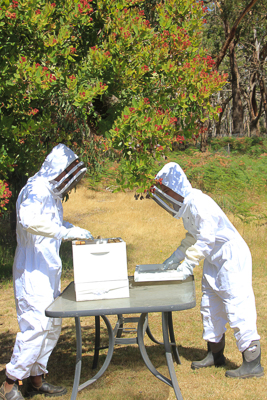 Our friends arrived the next morning with a bee box and bee suits. Thankfully, the swarm was about head height, so there was no need for ladders or other climbing equipment. The bee box was placed on a table directly under the swarm. First, they tried scooping the mass of bees into the box. This was partly successful, but the queen was still on the branch of the tree. To protect her, and avoid aggravating the swarm, the branch was snipped off and placed in the bee box. We all hoped her scent would lure the remaining bees into the box, so the lid was placed on, with just enough of an opening for the flying bees to land and enter.