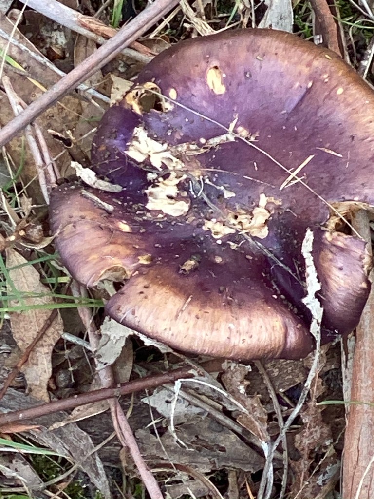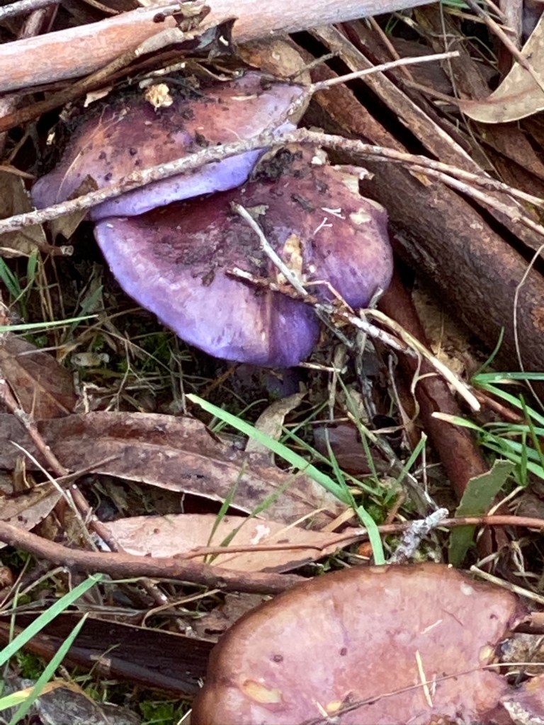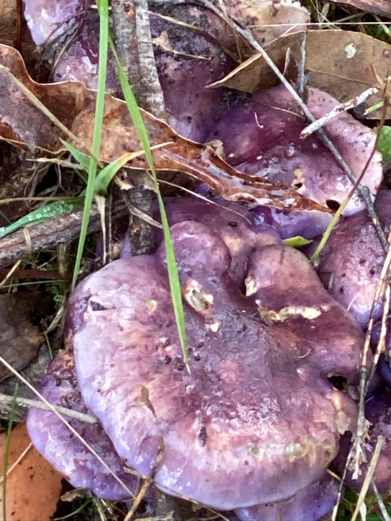 The information I found did not specify a common name, but the bright purple colour certainly made the group of mushrooms stand out. Some of them are sizable, and the larger the mushroom, the paler the purple.